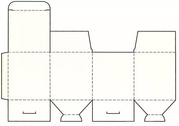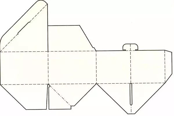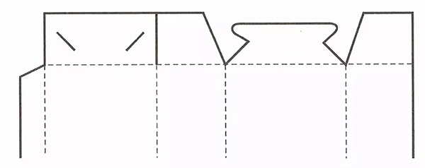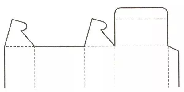 利用纸张的耐折和韧性的特征,采用弧线的折线,揿下压翼就可以实现封口。这种结构组装、开启、使用都极为方便,而且最为省纸,造型也优美,适合用于小商品的包装。