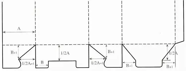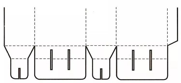 间壁封底式结构是将管式包装盒4个摇翼设计成具有间壁功能的结构,组装后在盒体内部会形成间壁,从而有效地分隔固定商品,起到良好的保护作用。其间壁与盒身为一体,可有效节省成本,而且这种包装盒结构抗压强度较高。