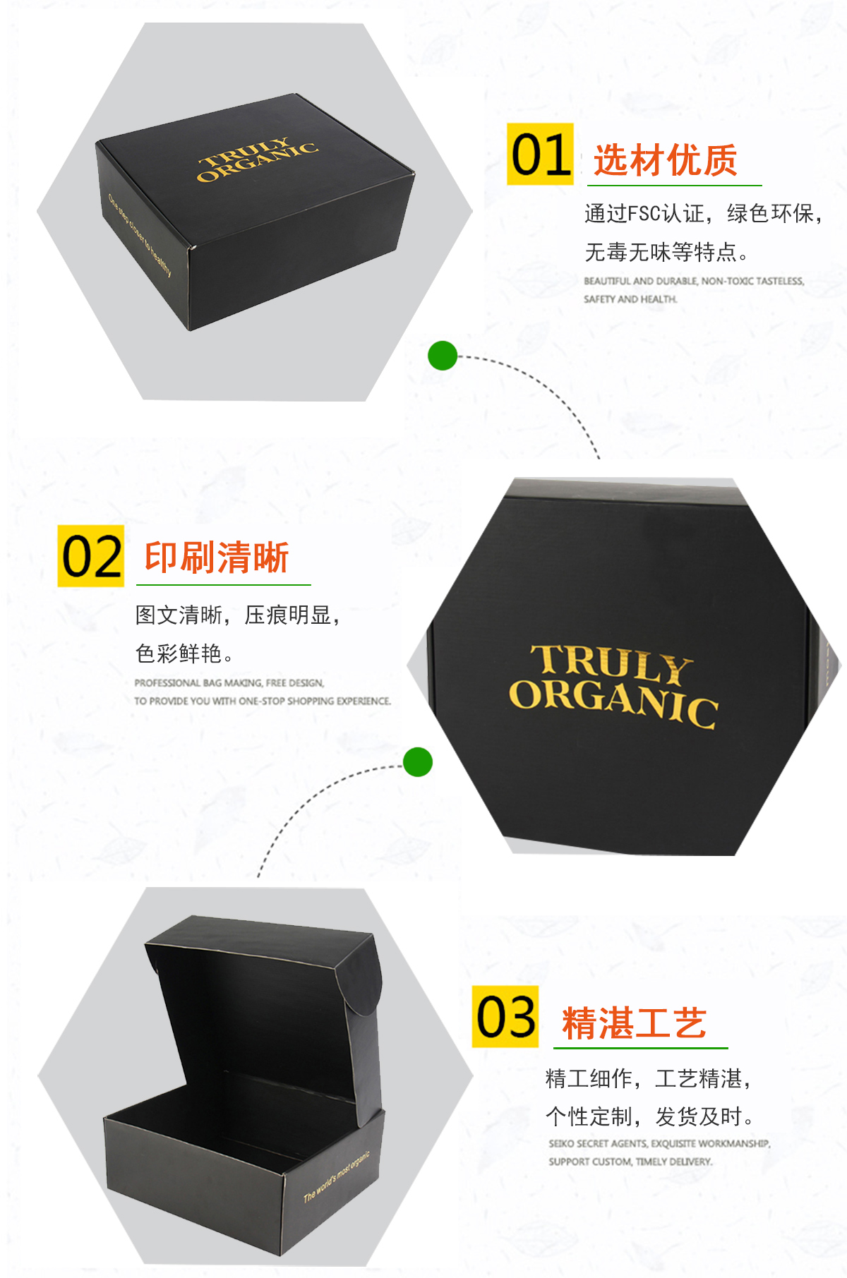 通过FSC认证的绿色环保原材料,实时跟进包装盒制作、印刷进度,把控各个细节,反复检测,品质保证;让您从此无后顾之忧!